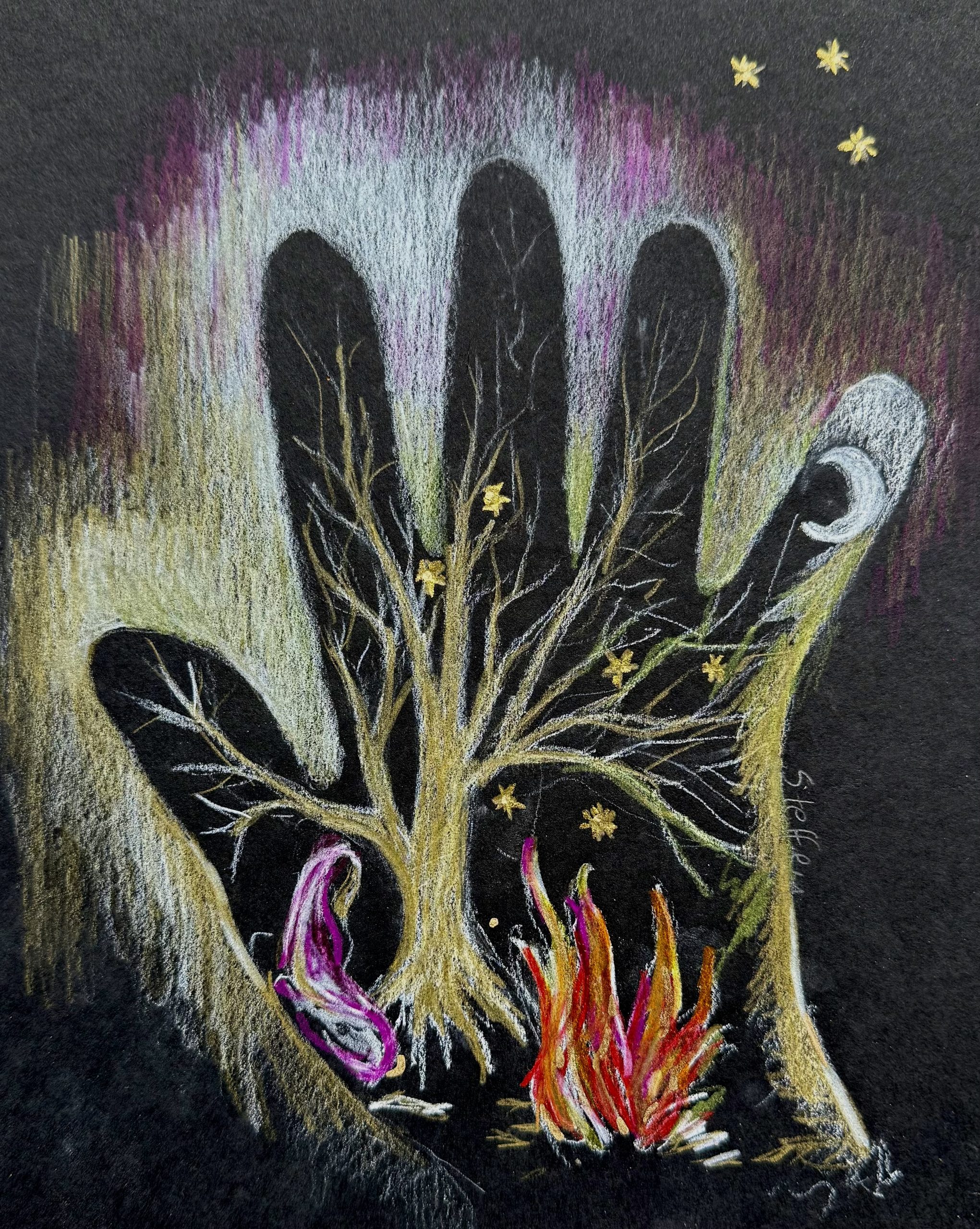 Soft colored pencil drawing of a scene with a woman tending a fire, inside a hand silhouette.